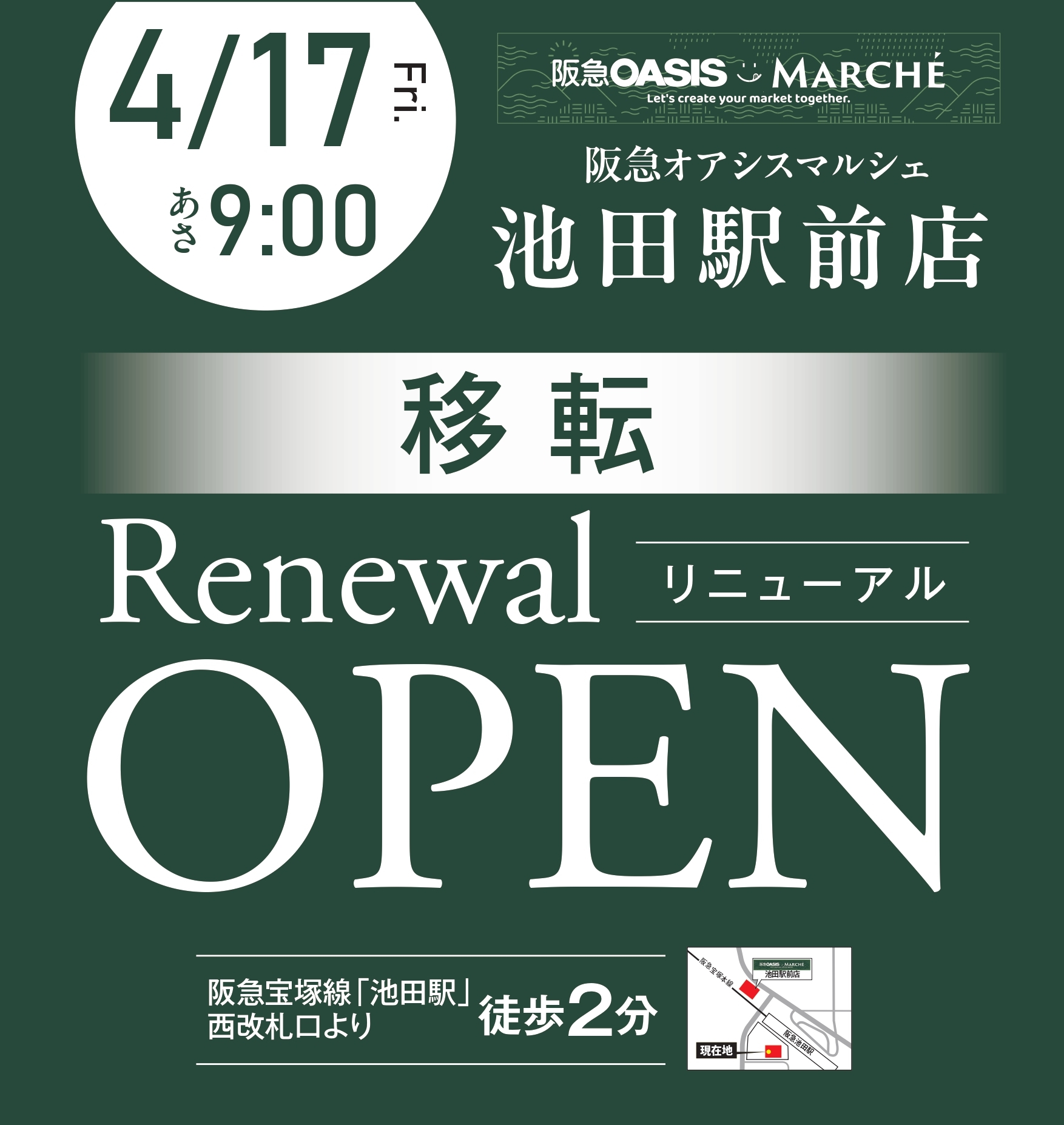 2026.04.17 「阪急オアシスマルシェ池田駅前店」 移転リニューアルオープンのお知らせ 阪急オアシス跡地にて、4/28(火)関西スーパーデイリーマート池田店が誕生します 前の記事 次の記事 お知らせ一覧へ戻る